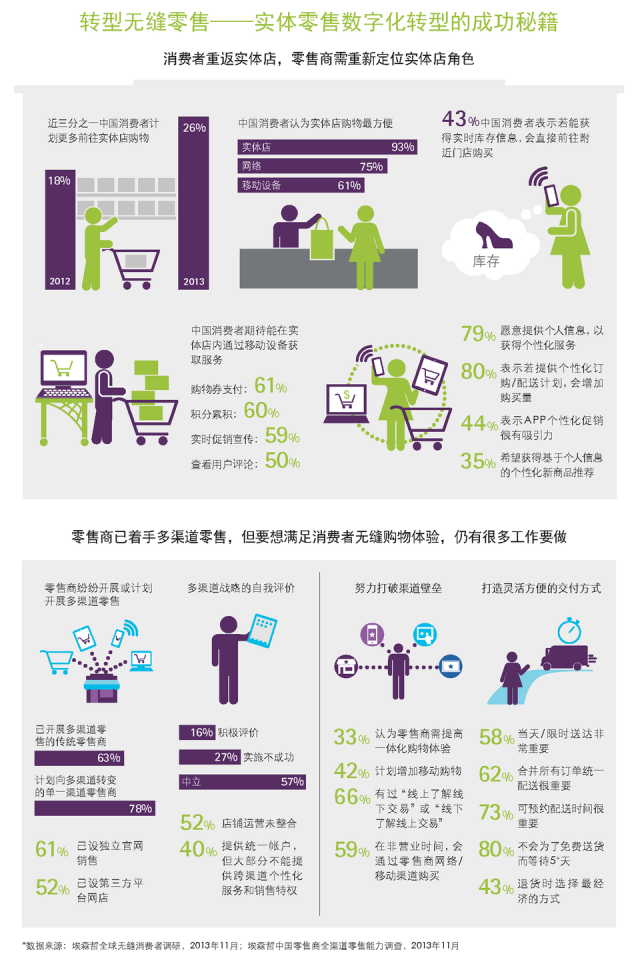 实体店的购物体验无可替代,但这不意味着实体店就可以墨守成规,而是应更积极地与线上渠道互相支持,产生更多影响消费者、方便消费者的触点,满足消费者不间断购物的需求。因此,如何重新定位实体店在多渠道中的角色,将会是零售商的机会之一。